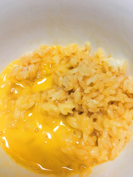 そして溶いた生卵をドンとかけ、あとは全体を混ぜたら完成!!