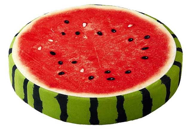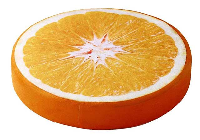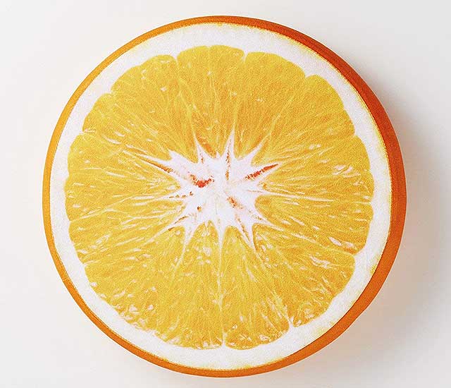 果汁たっぷり出てきそう… 目にも鮮やかなフルーツクッションは、さり気なくお部屋の雰囲気を引き立ててくれそうです。大きさは、直径38センチ、厚さ6.5センチと、椅子のクッションとしても使える大きさになっています。