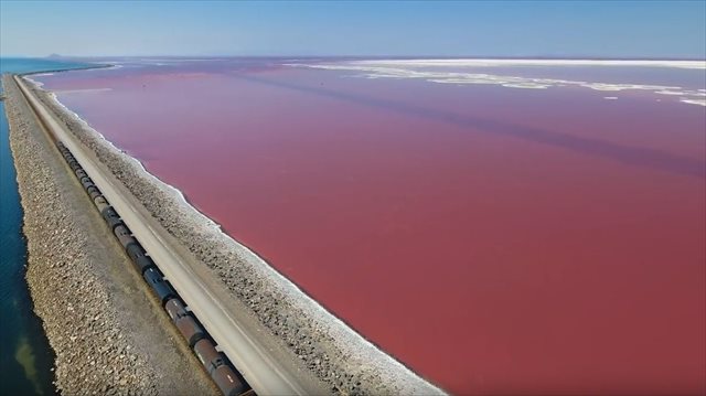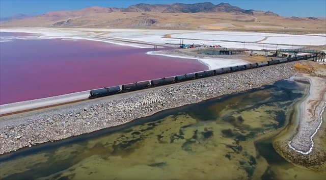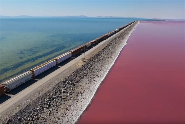 出典:YouTube(Great Salt Lake Causeway Train over Pink Salt Water)
