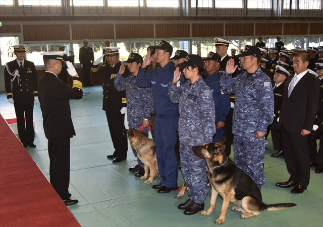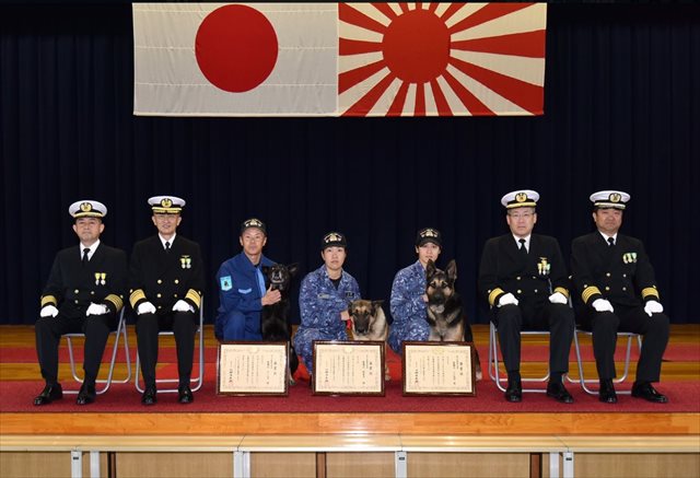 海上自衛隊呉地方総監は10月27日、「平成30年7月豪雨」において行方不明者の発見に寄与し、自衛隊の活動に大きく貢献した3匹の警備犬を表彰。呉造修補給所貯油所所属の警備犬さくら号、トド丸号、那智号です。