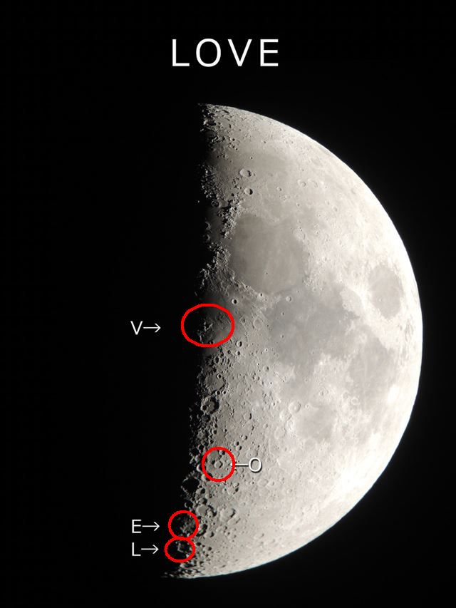 これは愛媛県の天文愛好家、竹尾昌(タケオマサル)さんが今年の3月に、なんとこの月面に浮かび上がる「L O V E」の文字を発見し、撮影に成功した1枚なのです!