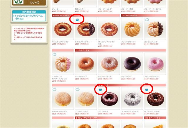 ちなみにこのトッピングホイップクリームは、ドーナツの左上にマークがついている「チョコファッション」や「チョコレート」「ダブルチョコレート」につけて食べるのがオススメのようです。