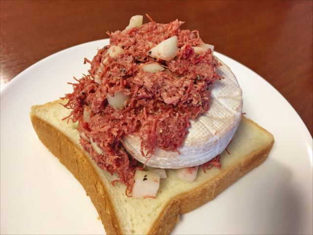 コンビーフ1缶、玉ねぎ(粗みじん)1/4個、たっぷりの黒胡椒を混ぜ、食パンの上にカマンベールチーズを覆うように乗せて、ホットサンドメーカーに押し込む→焼く→最高#ノザキのコンビーフの食べ方 pic.twitter.com/VoOEbvEw29— ノザキ(ノザキのコンビーフ)【公式】 (@nozaki1948) 2018年11月14日