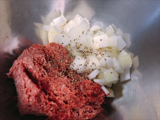 ①コンビーフ1缶、玉ねぎ(粗みじん)1/4個、たっぷりの黒胡椒を混ぜる