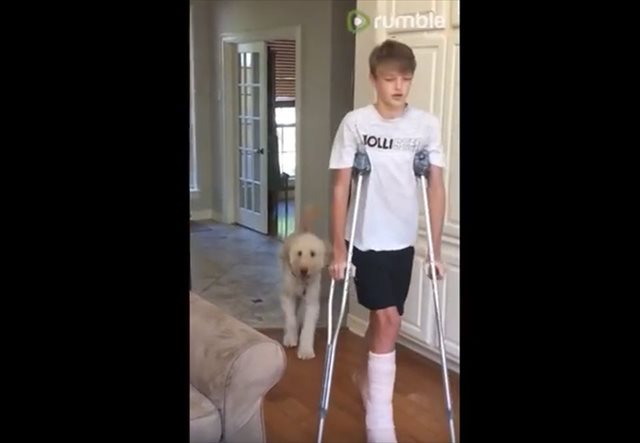 松葉杖で歩く飼い主…歩き方を真似しながらついていくワンコが微笑ましい♪