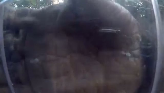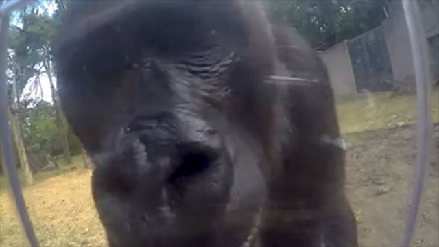 そんなGoProの存在に気づいたゴリラ。気になって仕方がないようです。「ん?コレ?」と言わんばかりに、カメラをのぞきこむゴリラ。つぶらな瞳が可愛らしいですね。カメラに興味津々です。