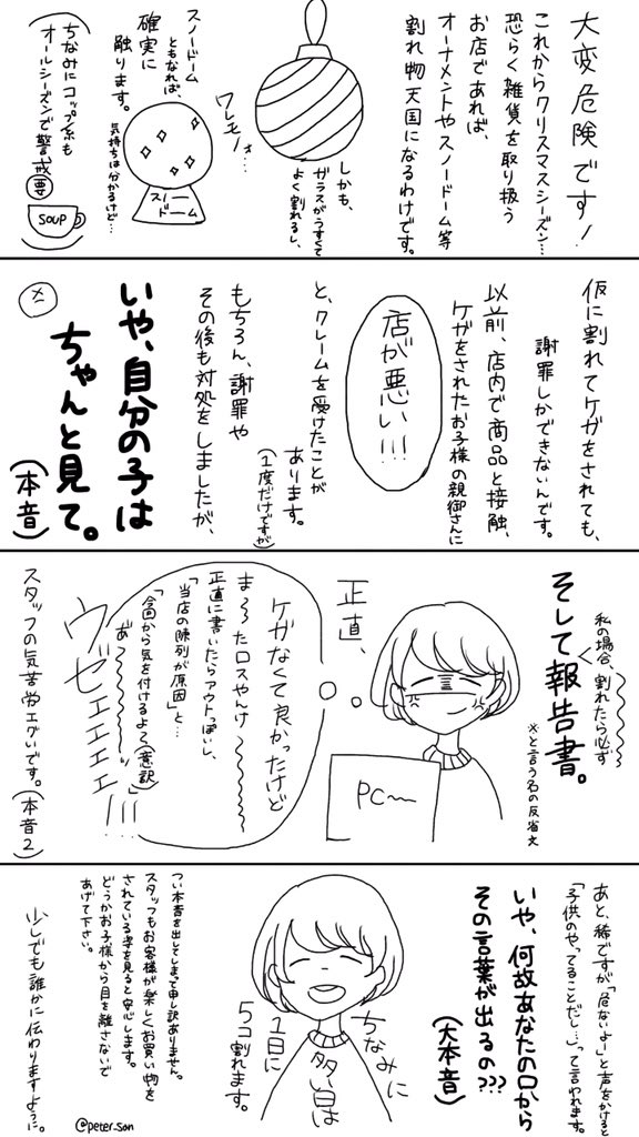 そんな中、雑貨屋さんでお勤めのぺーたーくん(@peter_san6)さんが、最近思うことをマンガにした作品がtwitterで話題になっています。