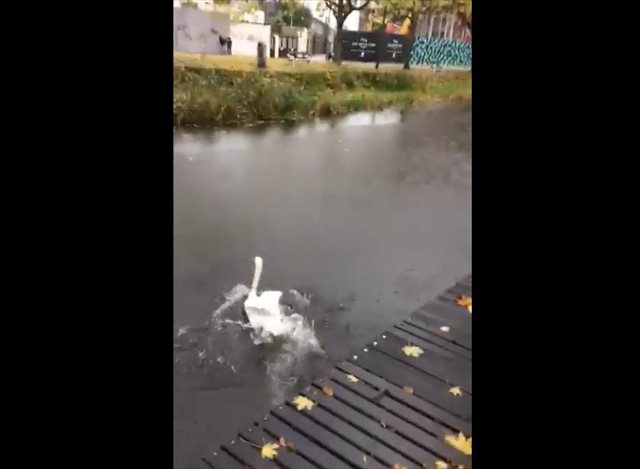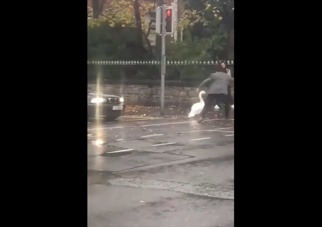 場所はアイルランドのダブリン。白鳥を見つけた男性は、獣医師をされているノエル・フィッツパトリックさんです。ウロウロと歩く白鳥が車道に出ないように、ガードしようとしている様子が分かります。