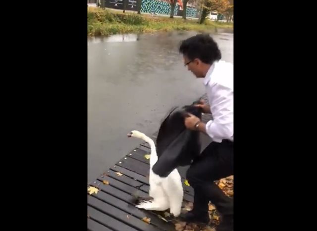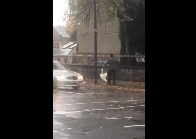 道路を歩いていた白鳥を見つけた一人の男性。白鳥が車にひかれることがないようにと、白鳥をガードしながら川まで連れて行きました。