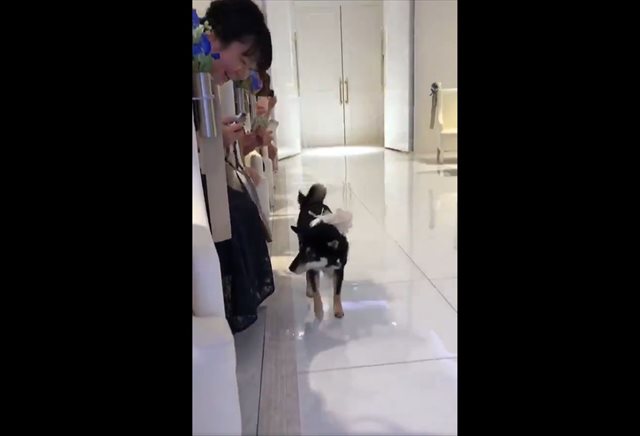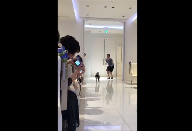 式場のスタッフに付き添われ、ワンコの柚子ちゃん(黒柴の女の子)が登場!