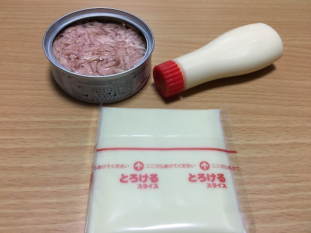 ▼ まずは材料を揃える。(ツナ缶、とろけるチーズ、マヨネーズ)