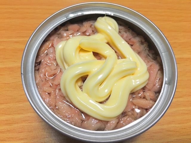 ▼ ツナ缶を開け中の油を少しだけ捨て、マヨネーズを投入(混ぜるか混ぜないかはお好みで!)