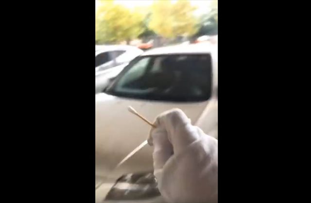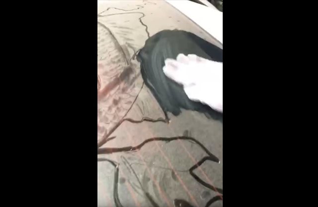 綿棒をペンのように器用mに使い、ほこりの積もったリアウインドウに何かを描き始めました。