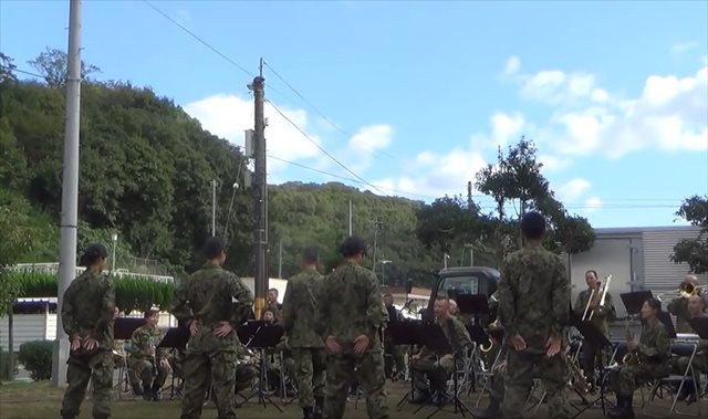 曲の始まる前、おもむろに後ろ向きで整列した自衛隊の皆さん。演奏するのも踊るのも自衛隊の方々です。