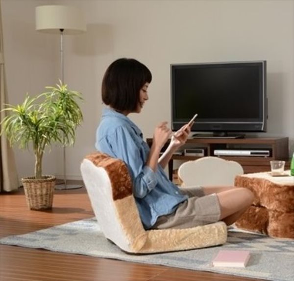 こちらが食パン座椅子。ふかふかのパンに座ってゆったりとくつろげます。5段階リクライニングで座面は低反発ウレタン仕様。機能性にも優れています。意外とどんなお部屋やインテリアにも合いそうです。