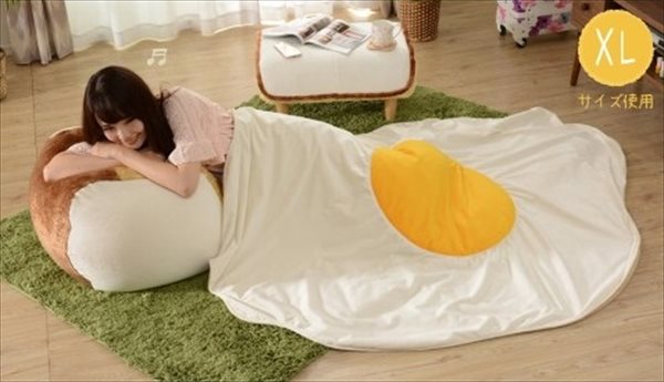 そして、こちらがめだまやきブランケット。めだまやきに包まれて寝る感覚は一体どのようなものなのでしょうか。端から見ていてもユニークですね。肌触りが良く、ほわほわの生地を使用しているとのこと。