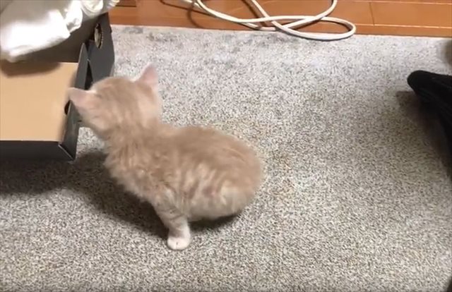 その後、再び飼い主さんがニャンコをカーペットに移動します。