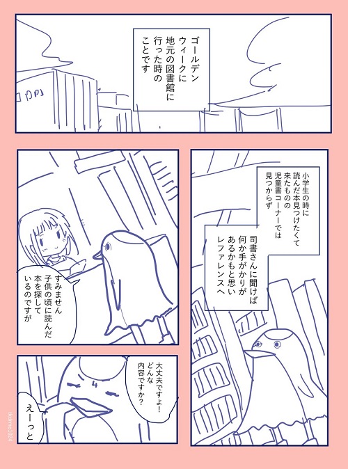 高鳥未唯(@tkdrme1024)さんはそんな本について、図書館で司書さんに尋ねてみたそうです。その時のエピソードを描いた漫画がTwitterで話題になっています。さっそくご覧ください。
