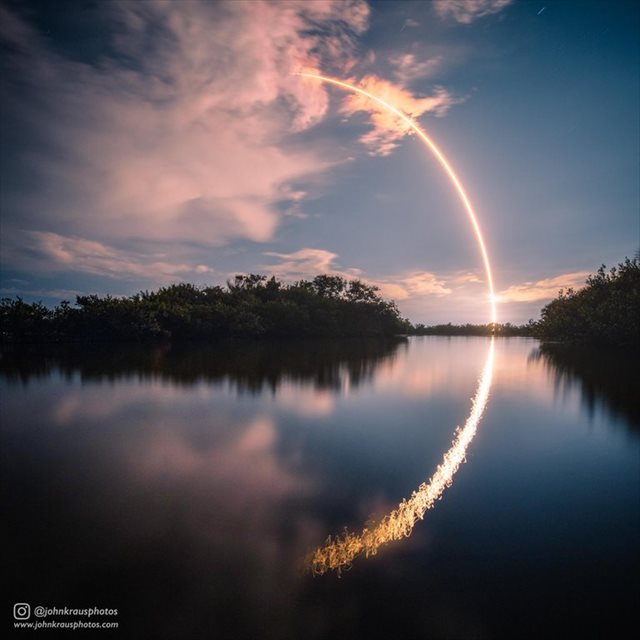 “長時間露光”で撮影されたファルコン9の打ち上げの写真。それだけでも十分に凄い写真なのですが、水面とも相まって奇跡の一枚に…!海外の掲示板サイトで投稿されていたのでご紹介します。