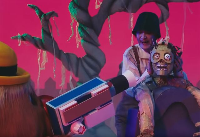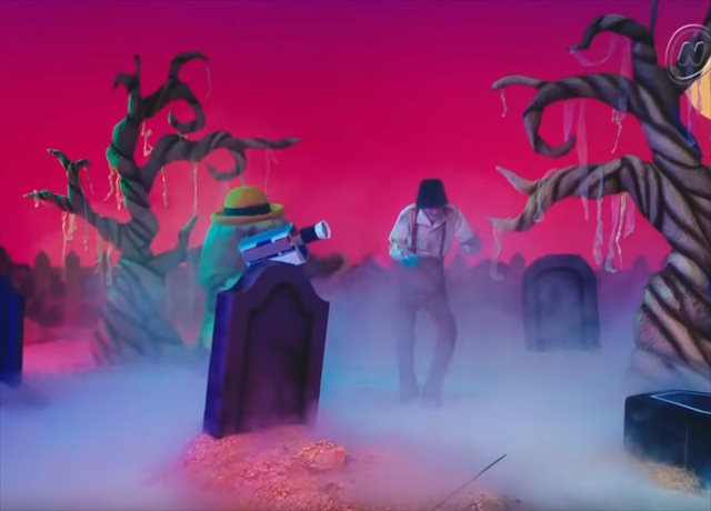 すると、段ボールで作られたゾンビの人形が出てきます。ノッポさんはゾンビ人形とダンスを開始。お馴染みのゴン太君はその様子をカメラで撮影します。