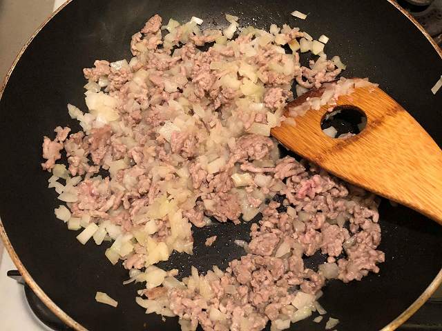 豚ひき肉をフライパンで熱し、肉から油が出てきたらチューブのニンニクと玉ねぎを炒めます。