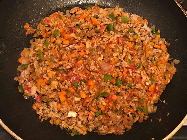 その他の野菜(今回は、ピーマン/人参/セロリ/まいたけを使用しましたが、お好みの野菜でOK)を加えて炒め、コンソメ、塩、胡椒、ハーブ、カットトマト、カレー粉で味付けします。