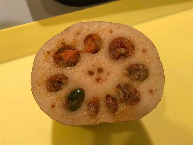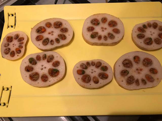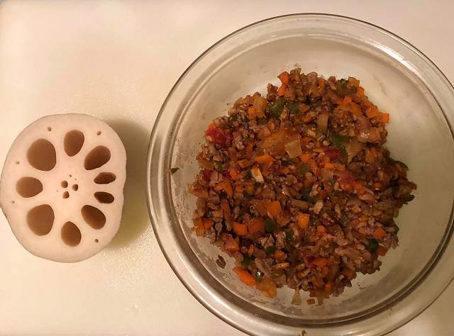 出来上がったキーマカレーの粗熱をとり、蓮根の穴に詰めていきます。この作業、最初は難航しましたが、ティースプーンなどで穴に入れてから、お箸などを使ってに具を下の方に少しずつ押し出して詰めたら上手くいきました。