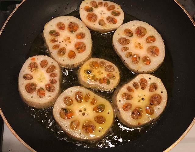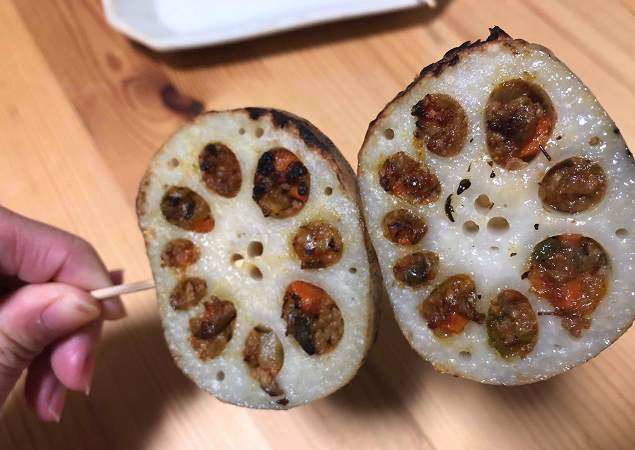 スーパーでインド人の顔なじみさんが大きな蓮根を買っていたので、「どんな風に料理するの?」と尋ねたら、「辛子蓮根みたいに穴の中にキーマカレーを詰め込んで、油で軽く揚げてから輪切りにして、焼き鳥みたいに串で焼くんだよ」と説明されて、「え!? 何そのステキ料理!!」と興奮した(笑)