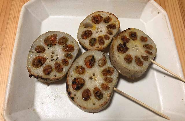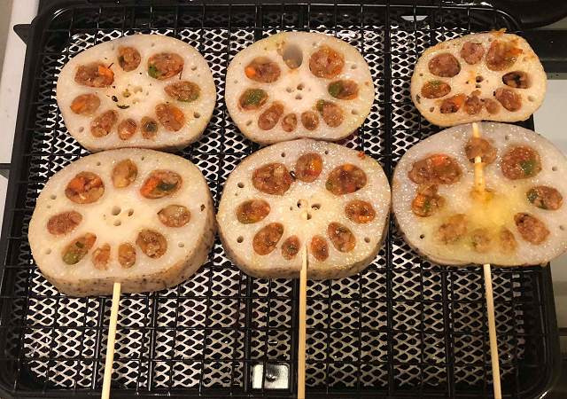 揚がった蓮根を串刺しにし、焼いていきます。