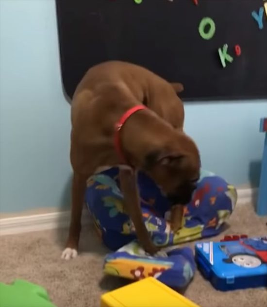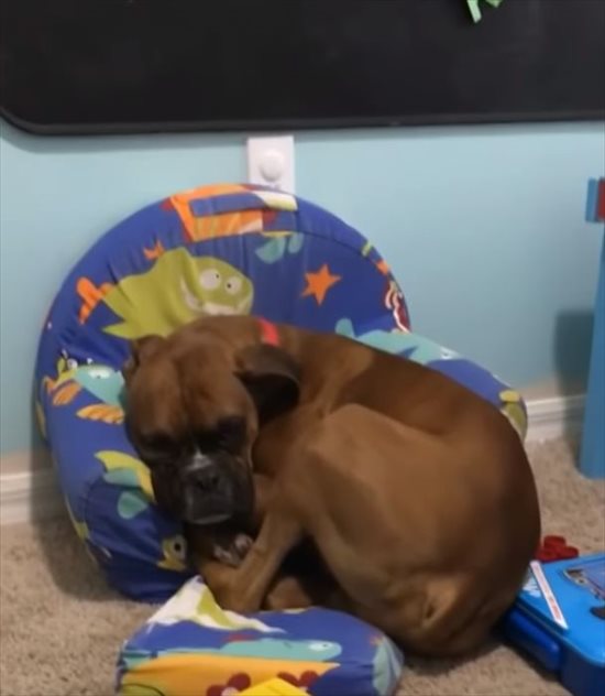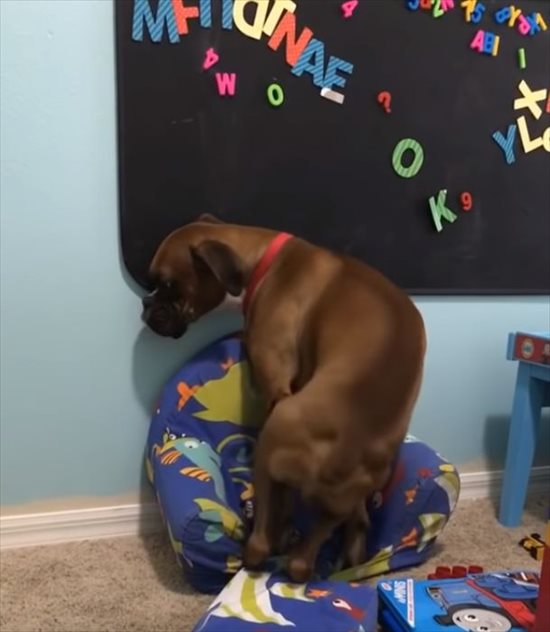 こちらがボクサー犬のジミー。ボクサー犬といえば、優雅な上品さと力強さ、穏やかな性格が人気です。そんなジミーが目の前にあった子供用の小さな椅子に座ろうとしています。