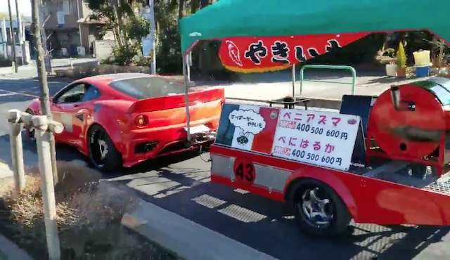 こち亀の実写版!?真っ赤なフェラーリがけん引する焼き芋リヤカーが話題に!