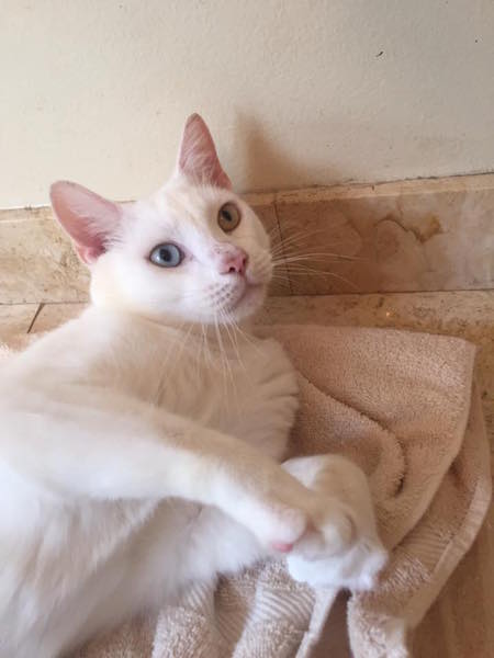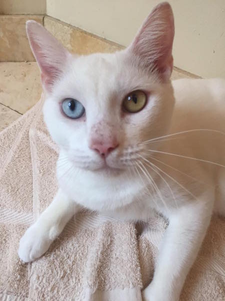 薄汚れ、ダニにより目が開かない状態だった顔が、治療の甲斐もあって完治し、真っ白な綺麗な顔に!しかも目の色が左右で違うんですね。かわいい!