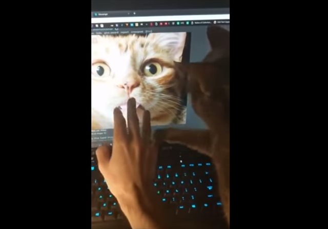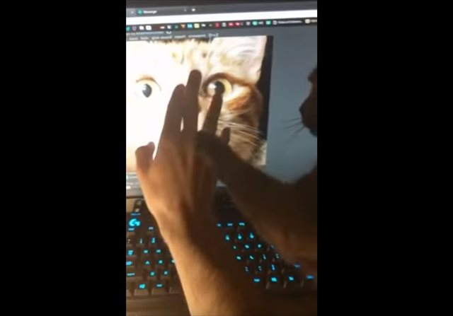 それでも懲りない飼い主さんは、再び画面の猫をタッチ!もちろん、飼い猫はそれを阻止しようと試みます。そして…