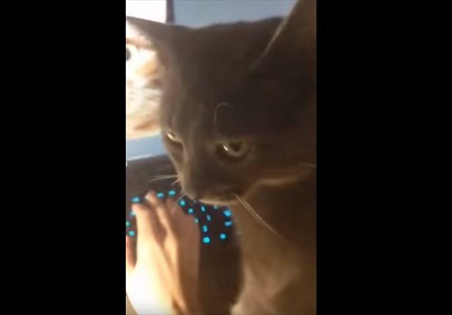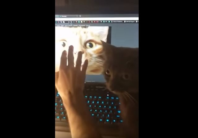 飼い主さんが画面の猫を触ってると… 飼い猫が飼い主さんの手を下げようとします。それでも再び触ろうとすると…