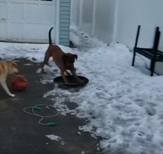 まるでソリのようにして薄く積もった雪の上を滑っています。めちゃめちゃ楽しそうです。