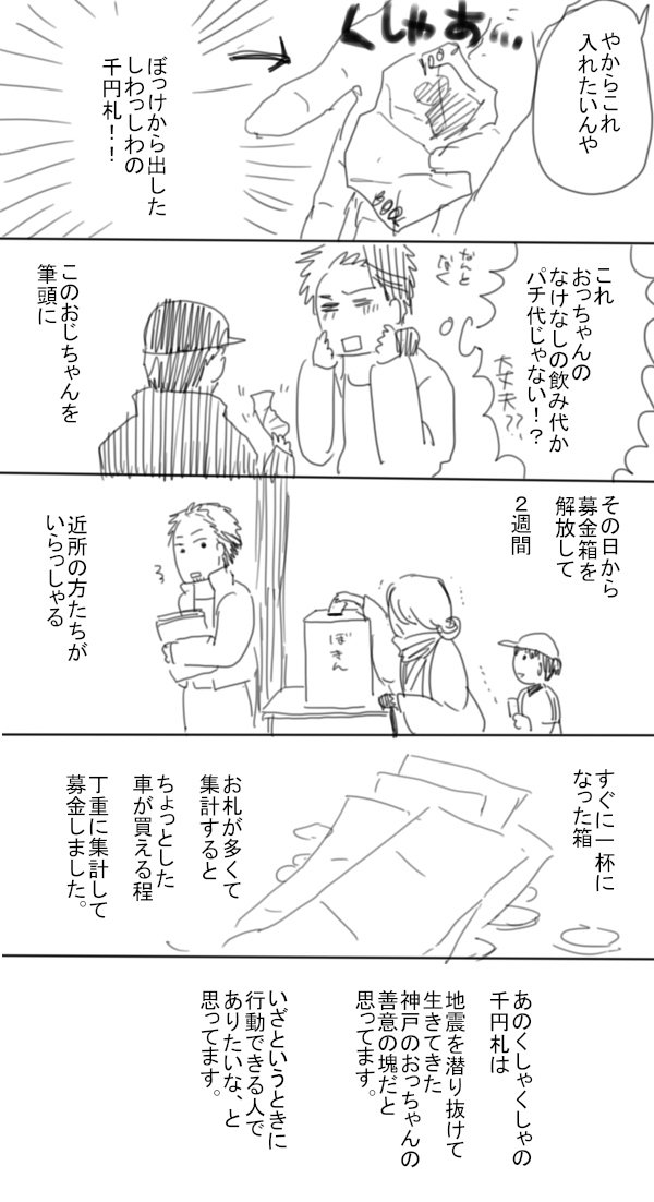 東日本大震災の日、関西の揺れはそこまで大きくなかったと記憶していますが、報道を見て、居ても立っても居られなくなったのでしょうか。おっちゃんや地域の人の行動から、被災地で生き抜いてきた人たちの苦労や、当時支援してくれた人への並々ならぬ感謝が感じとれます。