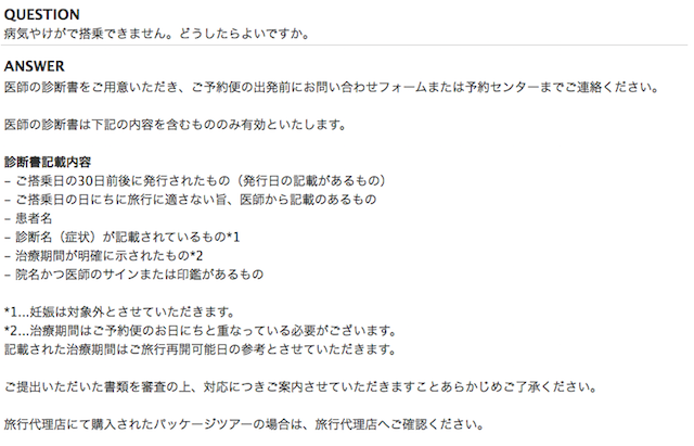 JALの場合も医師の診断書などの提出を条件に、取消/払戻手数料がかからない払い戻しが可能となります。