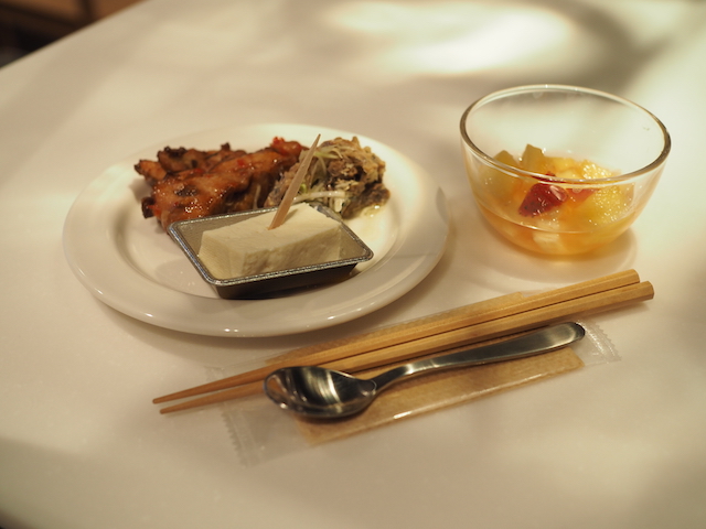 蓮池もちょいとお味見を!鶏肉をスイートチリソース的なもので和えた何かと、何かの和え物(ざっくりか(笑))、手作り豆腐にフルーツポンチですかね。