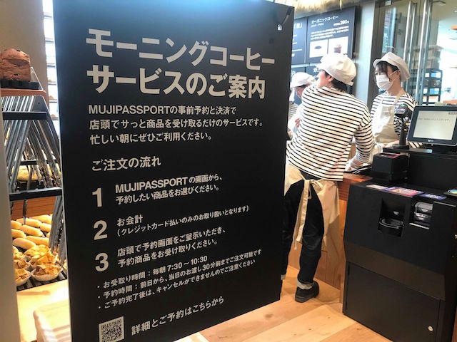 こちらは朝7:30に開店するので、出勤前などに気軽にコーヒーと焼きたてのパンを味わえるそうです。なんと、モーニングコーヒー予約サービスというものもあり、無印良品のアプリ”MUJI passport”から事前の注文と支払いをすることができるのだとか。朝急いでいる時にはとても嬉しいサービスですね。