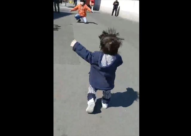 パーカーのフードが重いのに、一生懸命バランス取って走っていくのは
