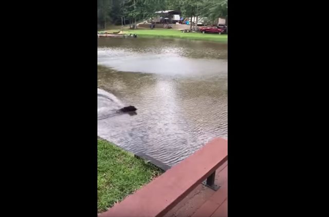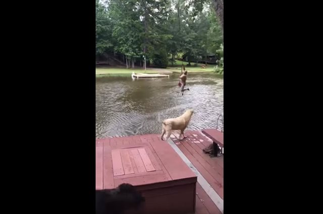 すると、飼い主はロープから手を放して、池にドボンッ!