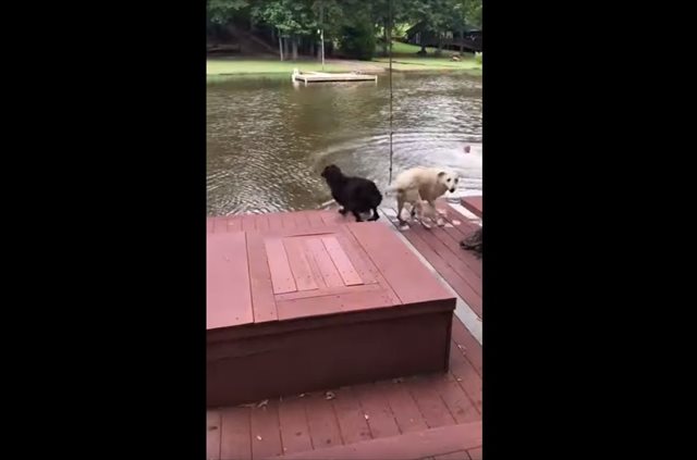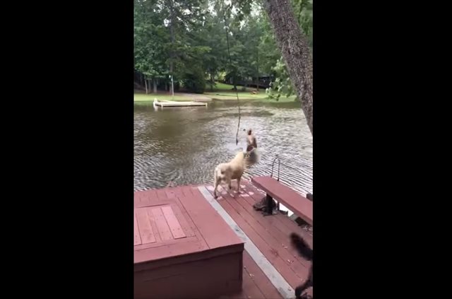 出典:YouTube(Dogs panic when owner swings out and falls into lake, then swim out to rescue him.)