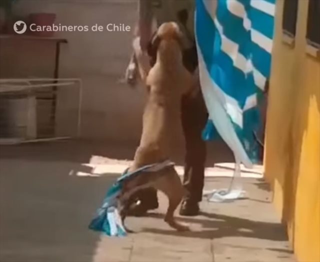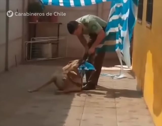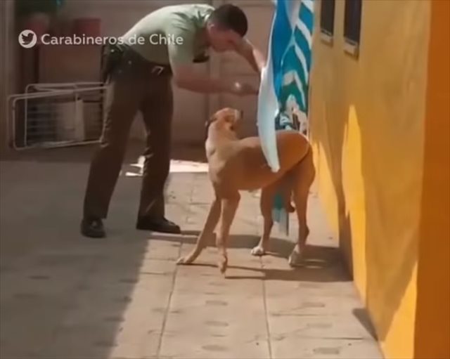 この出来事が起こったのは、チリのサンフェリペ市にある住宅街。ナイフを持った警察官がワンコに近づいていきます。警察官は、ナイフでワンコに絡まっているシートを切ろうとします。