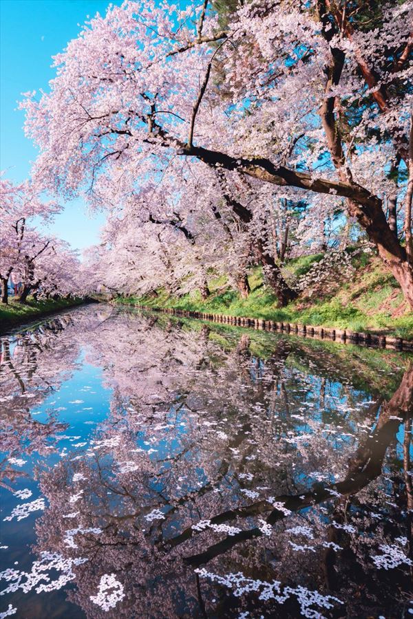 弘前公園の外濠に浮かぶ桜の花びらがとても美しいですね。そんな桜の絨毯の中を泳ぐ鴨の姿がなんだか優雅に見えます。