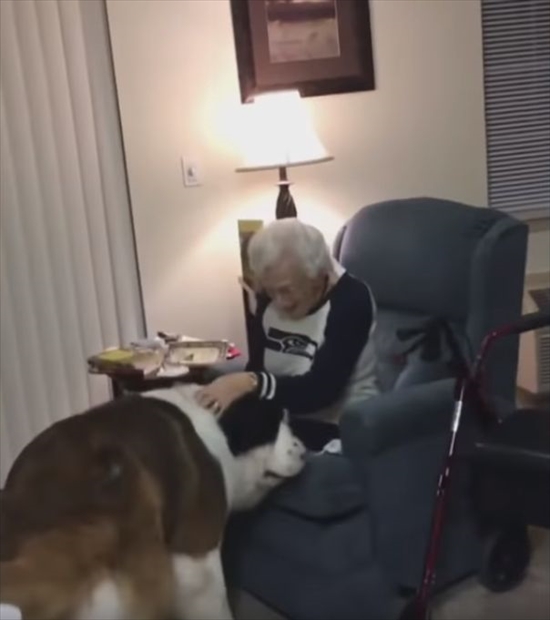 そこで、飼い主がワンコたちを連れて、サリーさんのいる介護施設を訪問。こちらはその時の様子です。