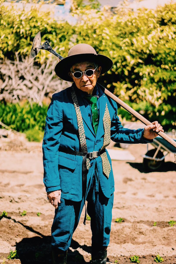 ハイブランドの服を颯爽と着こなすおじいさん、本当に素敵ですね。クワのようなものを持ったニヒルなポーズもキマっています(笑)