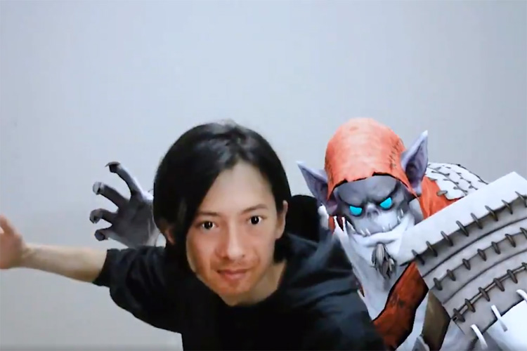 カメラが顔を認識するとキャラが背後に出現し、顔を動かせば同じ方角に構える。