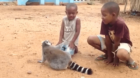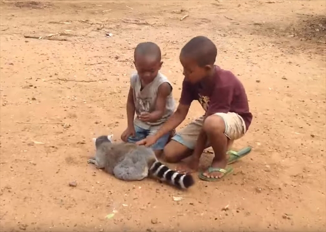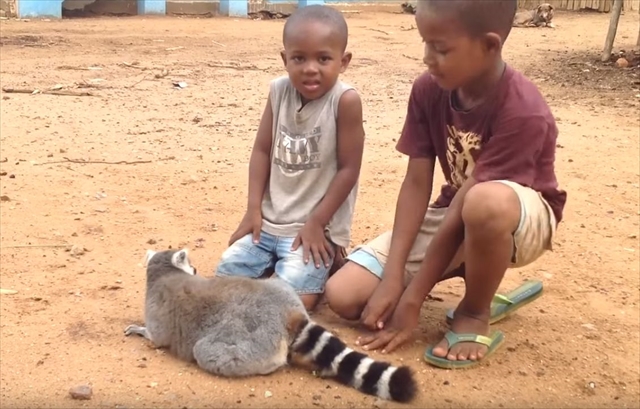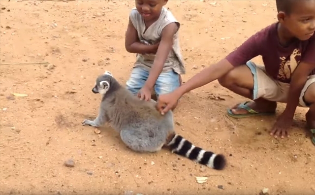 すごいアピールですよね(笑)。とても気持ちが良いのだと思いますが、この後見逃してくれたのでしょうか…。子供達とキツネザルの微笑ましい光景でした。