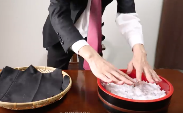 スーツの袖を破いてザルの上へ。ぐちゃぐちゃにちぎったワイシャツは、桶の中へ入れます。