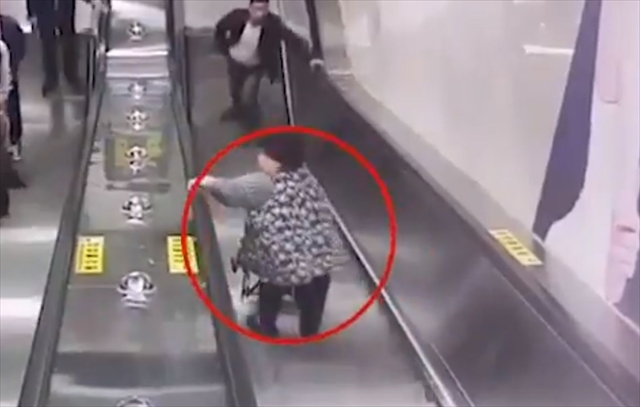 場所は中国のとある施設のエスカレーター。上から何かが落ちてくる音が聞こえたのか、女性が後ろを振り向こうとします。女性の前にいた男性もそれに気づいたのか、振り向いてエスカレーターをダッシュでのぼり始めます。